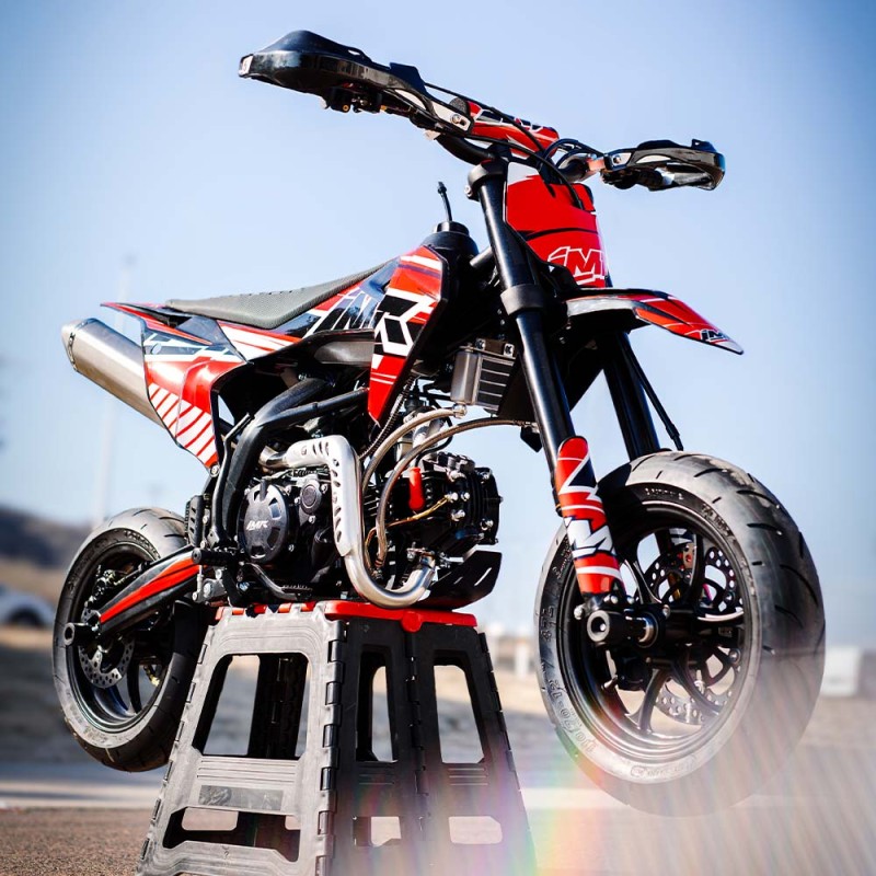 Model IMR Race Pro Pit Bike wyposażony w 12-calowe aluminiowe koła oraz przednie zawieszenie ze specjalną konfiguracją supermotard, zapewniającą większą sztywność i lepsze osiągi.