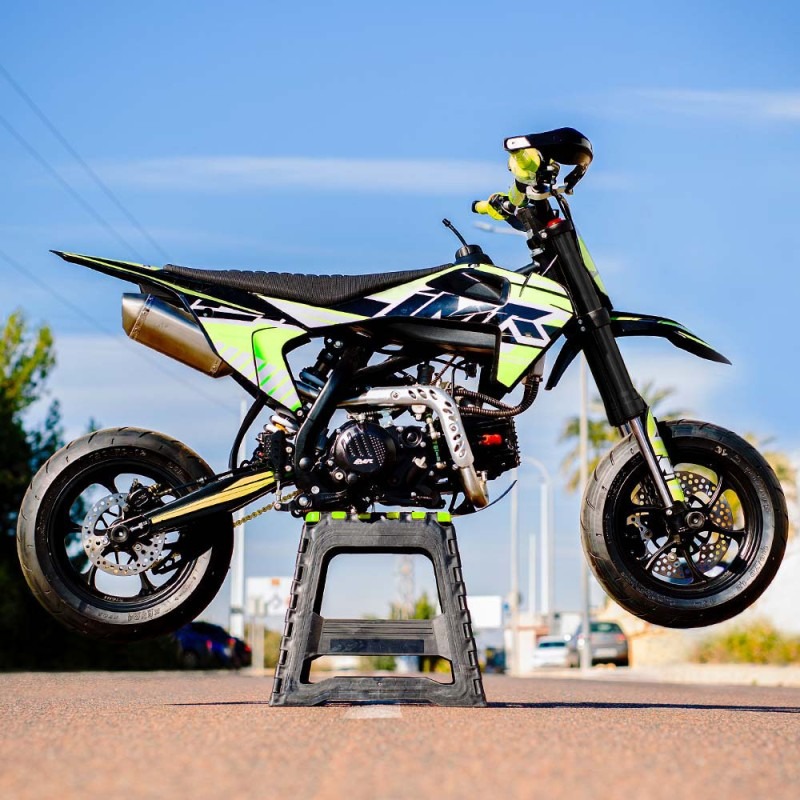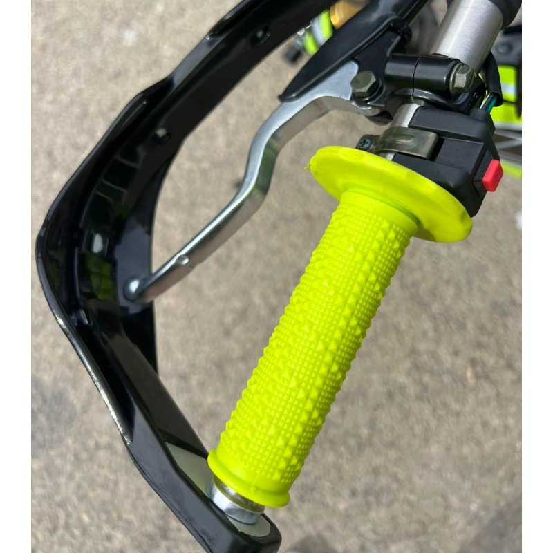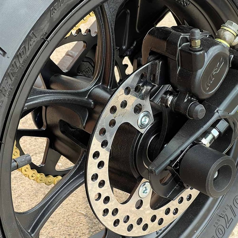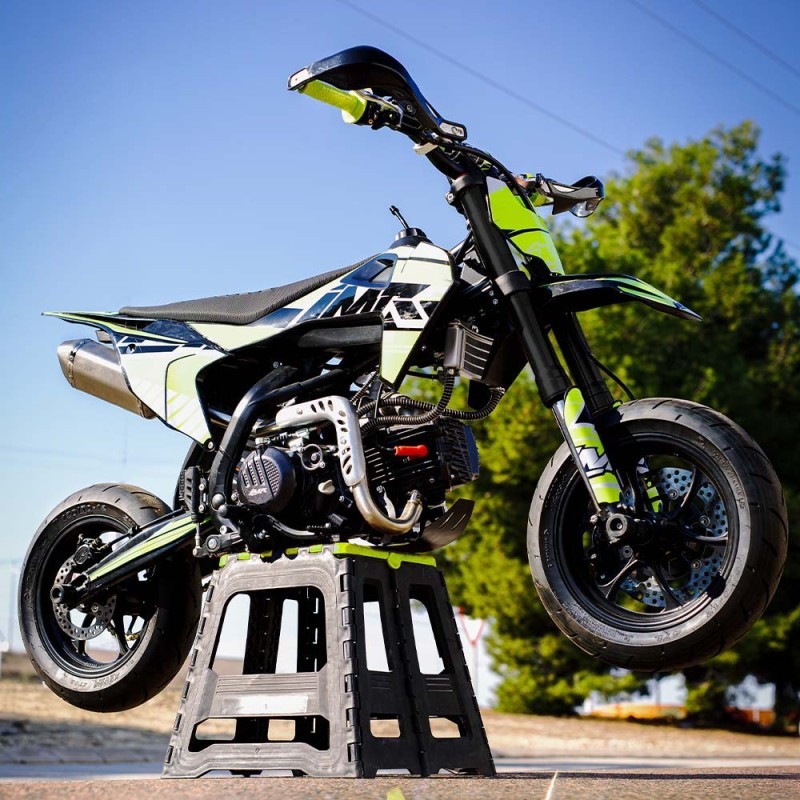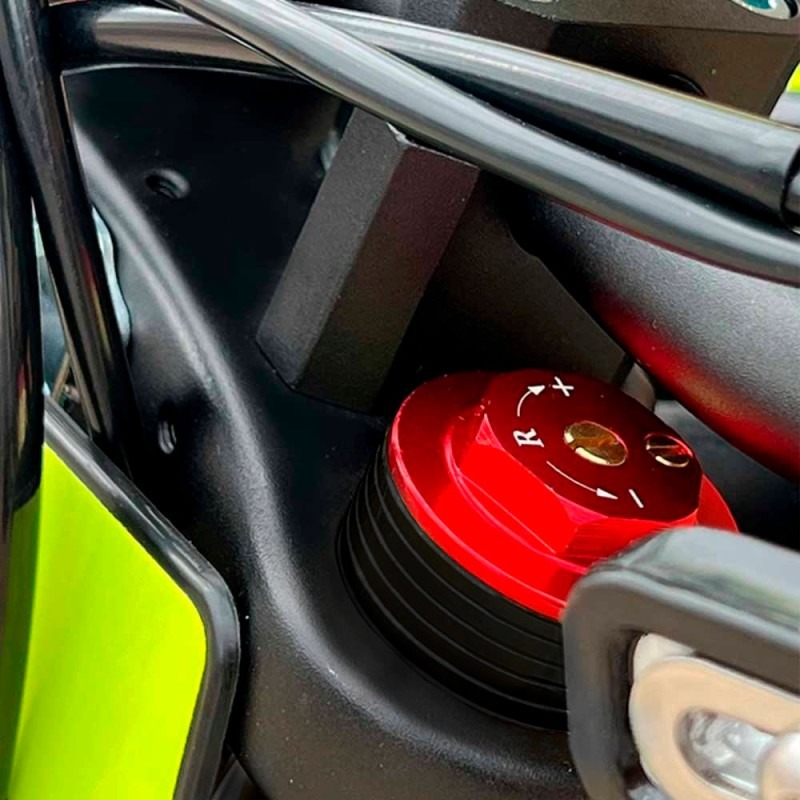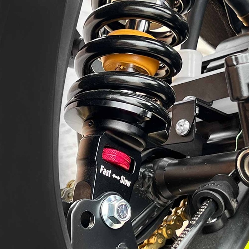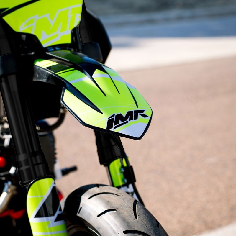 Przednie zawieszenie to odwrócony i regulowany widelec IMR V2 ze specjalną konfiguracją dla supermotocykli z dłuższą rurą wydechową – dzięki temu uzyskano większą sztywność i lepsze prowadzenie na torach asfaltowych.